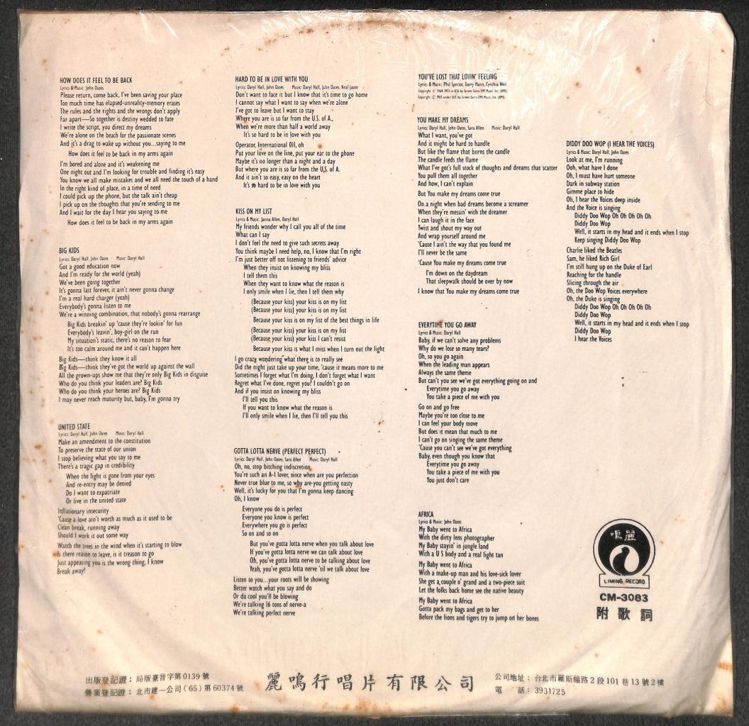 AMM18 Daryl Hall & John Oates Voices Mega Rare Taiwan Chinese Label English 12" LP ELP2362